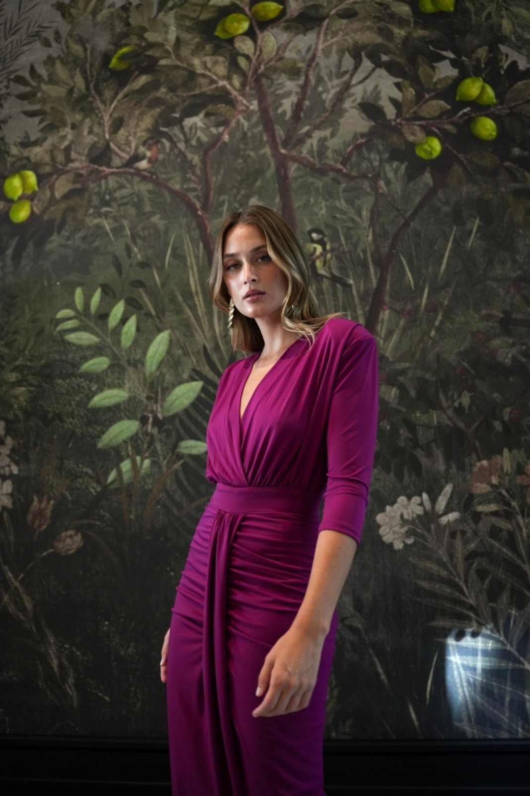 Το φόρεμα είναι κατασκευασμένο από μεταξωτό πλεκτό με σταυρωτό ντεκολτέ. Πέφτει στη φούστα με πλαϊνό ντραπέ. Εσωτερικές επενδύσεις και αόρατο φερμουάρ στην πλάτη. Είναι πλήρως επενδεδυμένο.