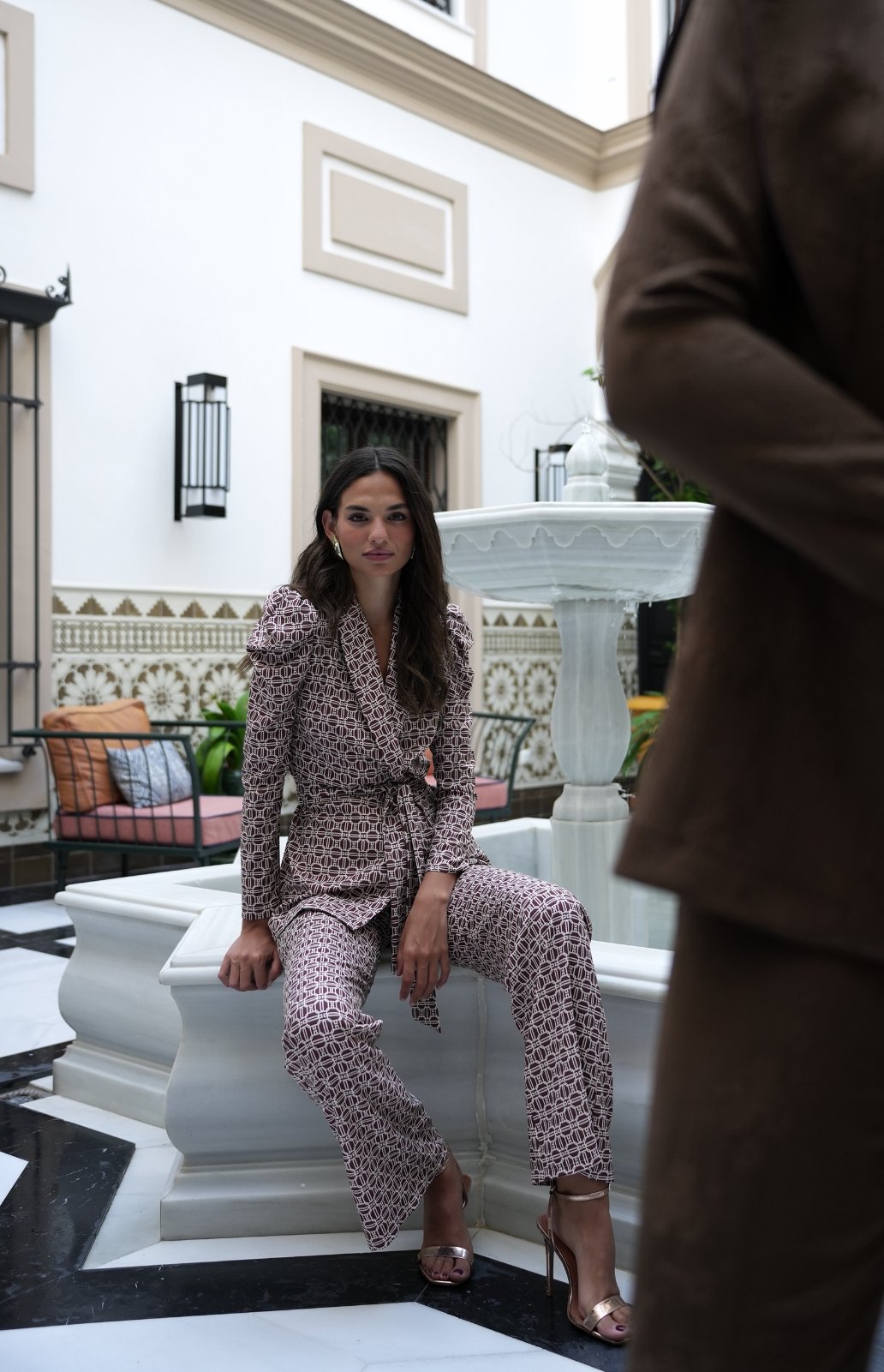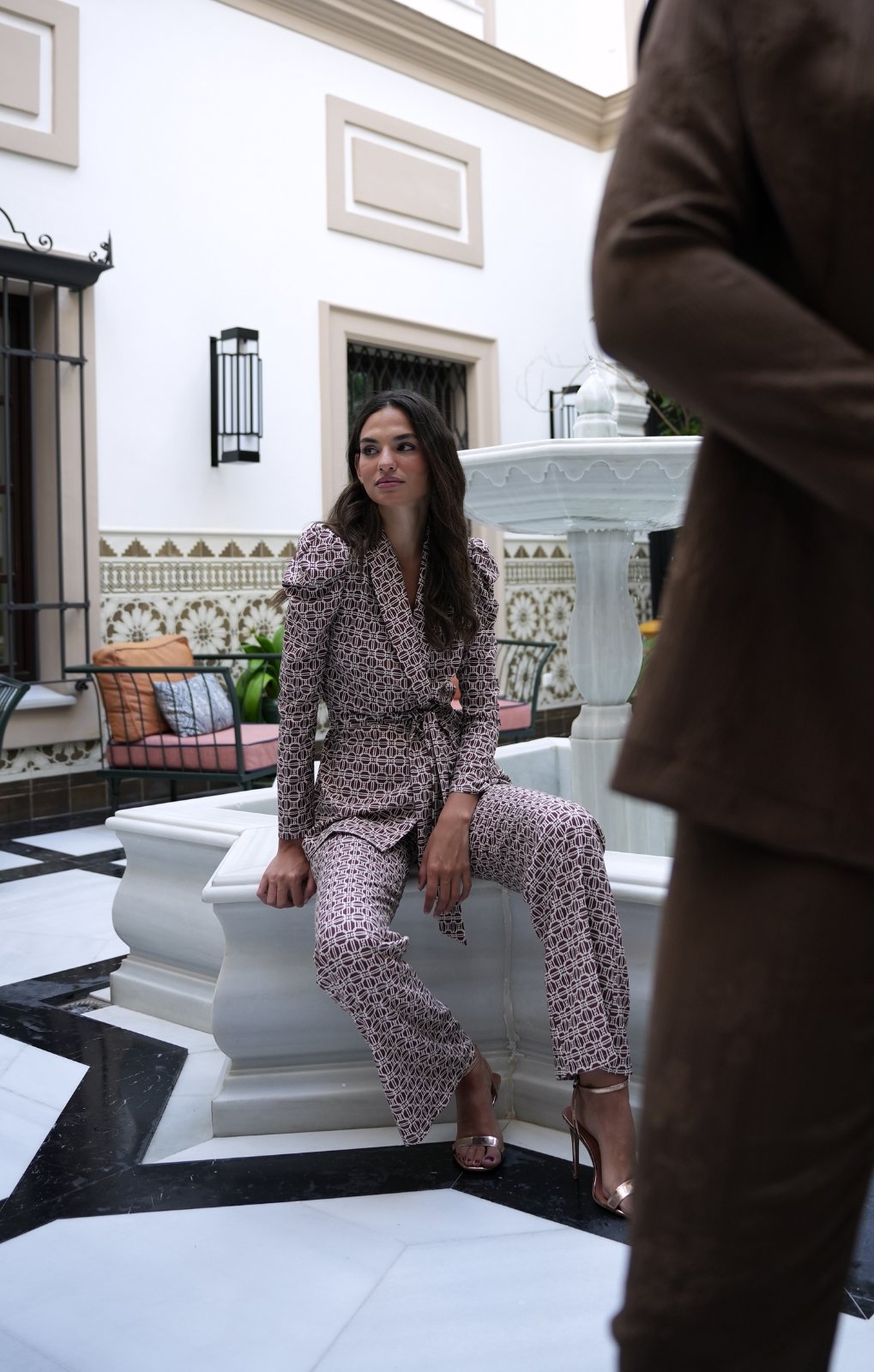 Κοστούμι με σακάκι-παντελόνι από τυπωμένο κρεπ με ελαστάνη. Μπλούζα με σούρες στα μανίκια και εσωτερική επένδυση στους ώμους. Ρυθμιζόμενο με ζώνη. Παντελόνι με φαρδιά πόδια, πλαϊνές τσέπες και άριστο πατρόν από φρέσκο ύφασμα.